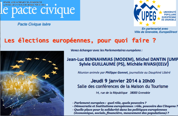 Venez échanger avec les Parlementaires européens : Jean-Luc BENNAHMIAS (MODEM), Michel DANTIN (UMP), Sylvie GUILLAUME (PS), Michèle RIVASI(EELV). Réunion animée par Philippe Gonnet, journaliste au Dauphiné Libéré. Au programme: - Parlement européen : quel rôle, quels pouvoirs ? - Démocratie…