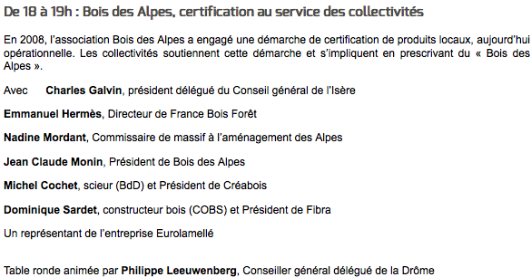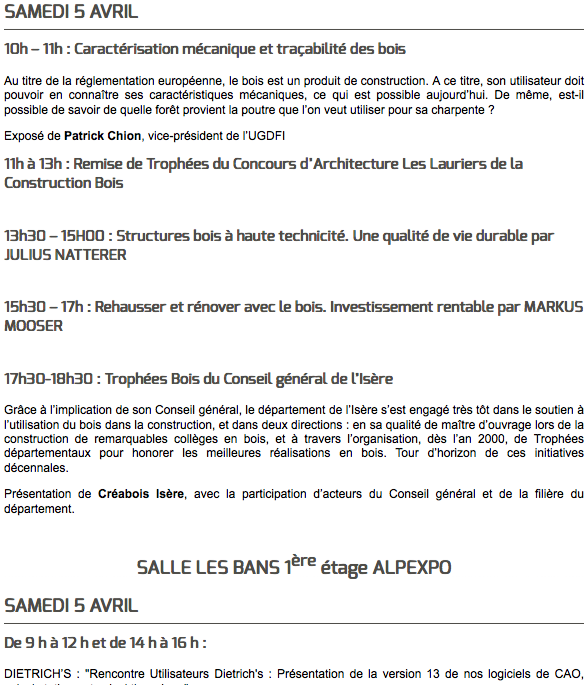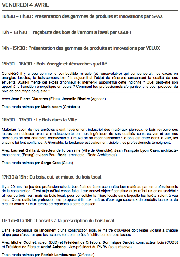 Le salon du bois qui se déroule à Alpexpo Grenoble, du 3 au 6 avril, sera cheminé par plusieurs conférences dont en voici le programme.