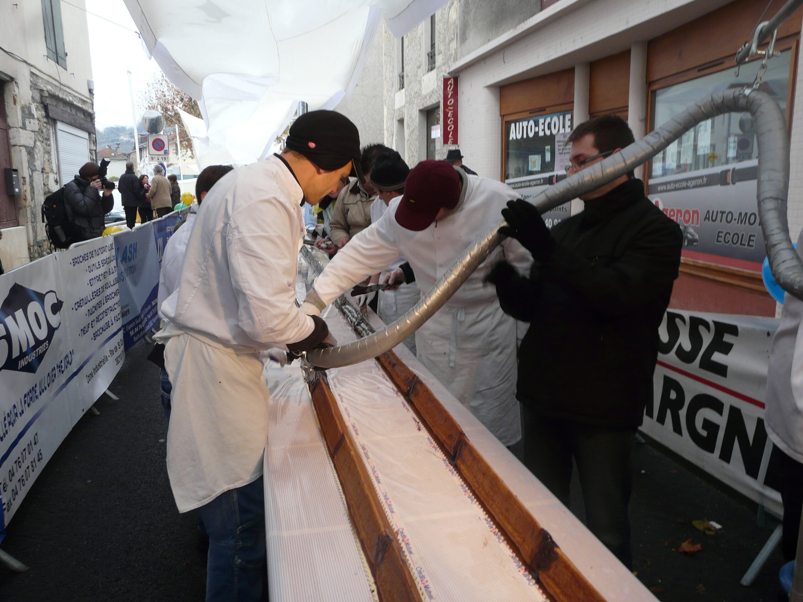 L’idée a très vite été acceptée par l’ensemble des partenaires, associations locales, la filière noix à travers le CING, Coopenoix, les nuciculteurs locaux a adhéré à ce projet avec un enthousiasme débordant. Ensemble, aidés par une centaine de bénévoles, ils ont réussi le pari de confectionner un gâteau d’une longueur totale de 286,15 mètres. Marcel Marron, maire de la commune, accompagné par André Vallini sénateur et président du conseil général de l’Isère étant les témoins officiels de ce record. Pour ce il a bien entendu fallu fermer une rue!