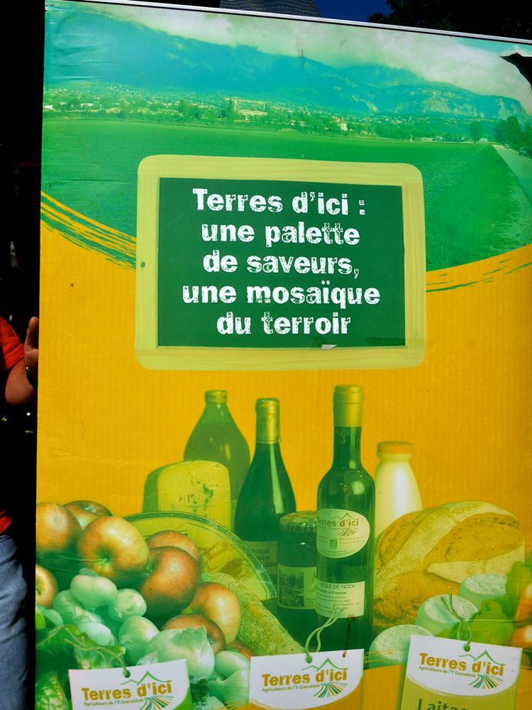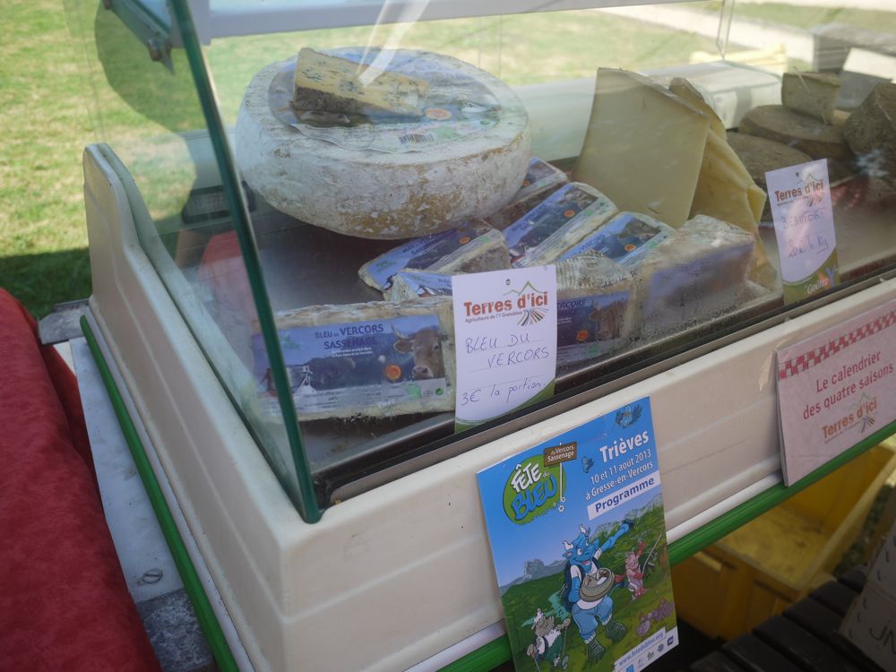 Produits issus de l’Y grenoblois.. avec une petite originalité. On trouvait également du Bleu du Vercors Sassenage. Une façon pour les agriculteurs de « Terres d’ici » de participer à la fête du Bleu qui se déroulait en même temps à Gresse en Vercors.